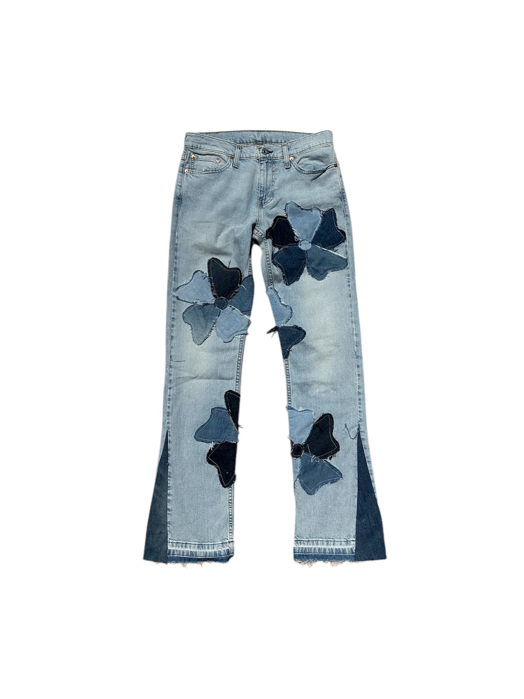 Strategically placed patchwork flowers across the front and back legs, while deep indigo side panels. Finished with raw hems and visible stitch work.