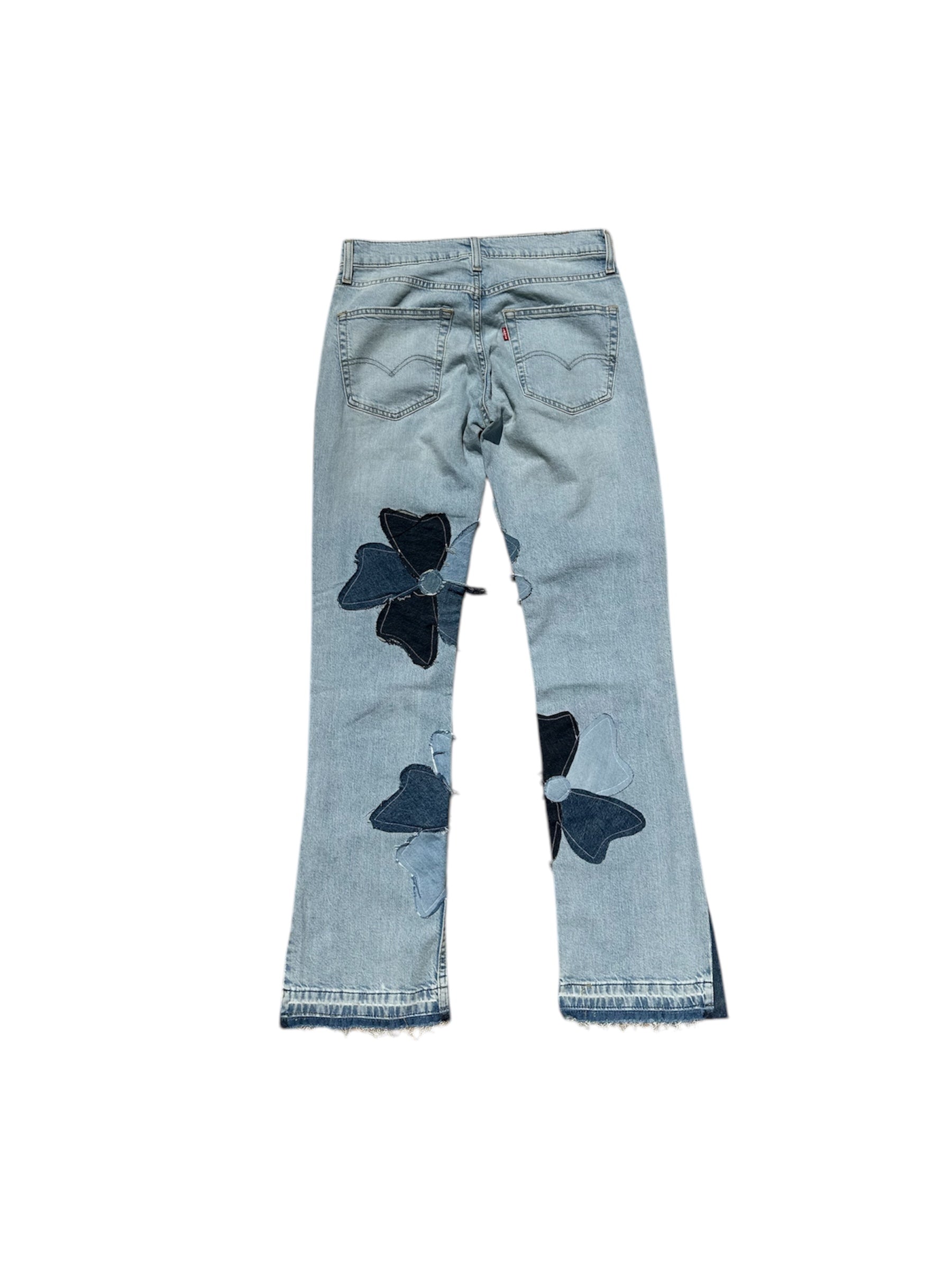 Made from Levi's, this one-of-a-kind piece features oversized denim flower appliqués in contrasting indigo shades, giving each pair an unmistakable personality.